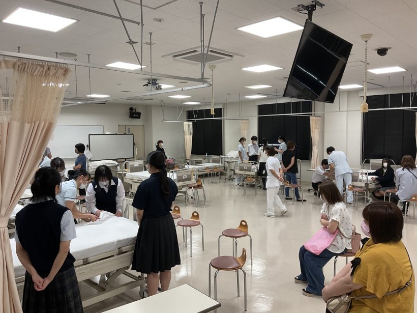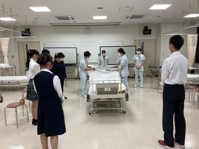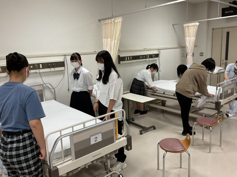 そして、授業で使用している実習室へ移動し、ミニ体験「ベッドメイキング」を行いました。