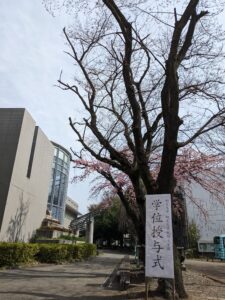 学位授与式に間に合わせてくれたかのように、校舎前の桜が花開きました。