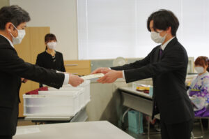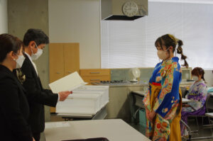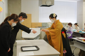 式典終了後は学科ごとに分かれて、学科長から学生一人ひとりに学位記を手渡しました。