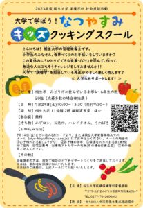 2023年度 ぐんま未来大学医療保健学部 栄養学科の社会貢献活動として、7月29日土曜日にキッズクッキングスクールを実施します。