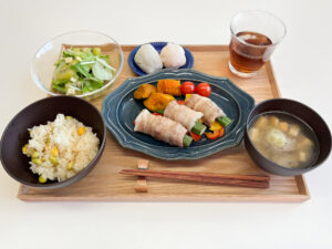 豚肉の夏野菜巻き、フリフリサラダ、いわしのつみれ汁です。
