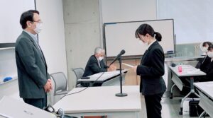 続いて学長から、学生代表の保坂さんに記念品が授与されました。