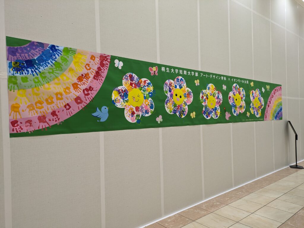 幼児児童を対象とした企画では、学生が考案したデザイン画をもとに、子どもたちが手形でお花や虹の絵を描く活動が行われました。この活動は、イオンモール太田の店舗仮囲いを利用して展示されており、FMぐんまの「POTLUCK」のコーナー「ユニラジ 県内の大学生の今をお伝えします!」でも取り上げられ、デザイン画の考案者である福島さんが出演しました。