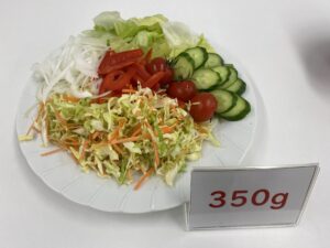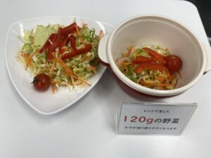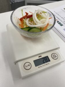 もう一つのミニ体験「野菜、足りていますか?」は、感覚で120gの野菜サラダを量る体験でした。