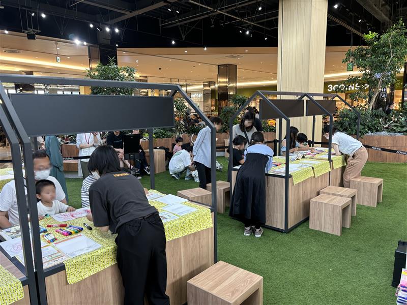 先日、イオンモール太田さんとのコラボレーション活動の一環として、専門店街2Fのピクニックコートにてお絵描きワークショップを開催しました。このワークショップでは、たくさんの子どもたちが参加し、「MYボトルデザインコンテスト」に応募するためのイラストを描く楽しさを体験しました。