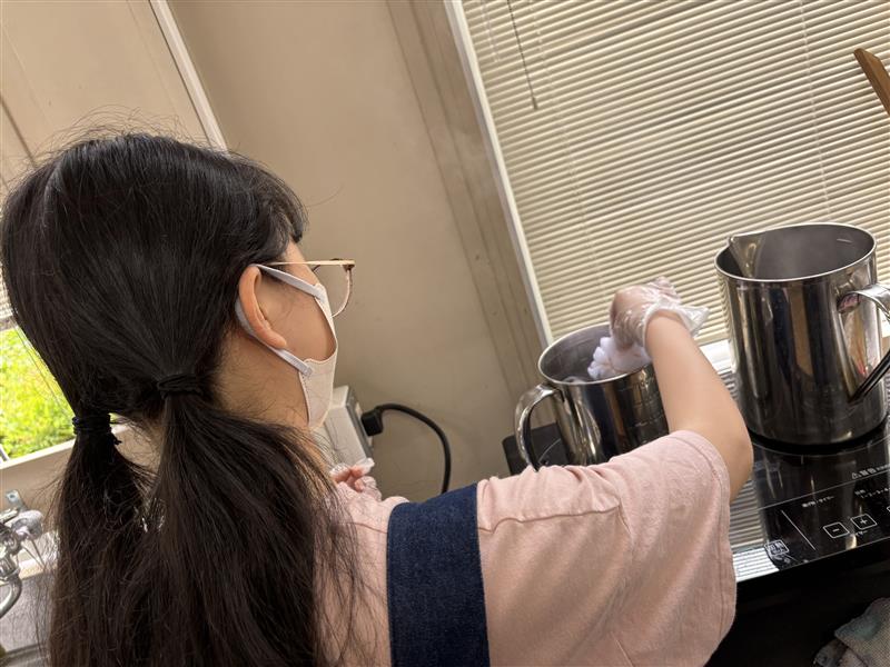 実習のメインは、ポリエステル素材の染色体験です。赤・青・黄色の三原色を使い、濃色と淡色のバリエーションを実際に染めていきました。赤・青・黄色の三原色で濃色と淡色の染色を体験しました。