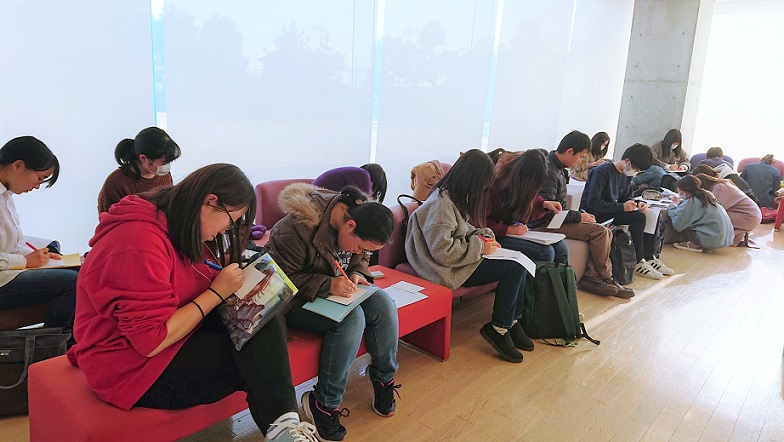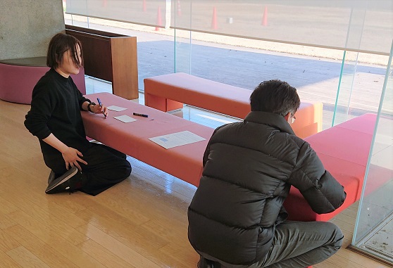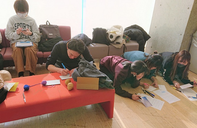 廣瀬先生が用意したポストカードを使い、自分宛ともう1枚送りたい相手宛にメッセージを書き、専用の箱に投函すると、