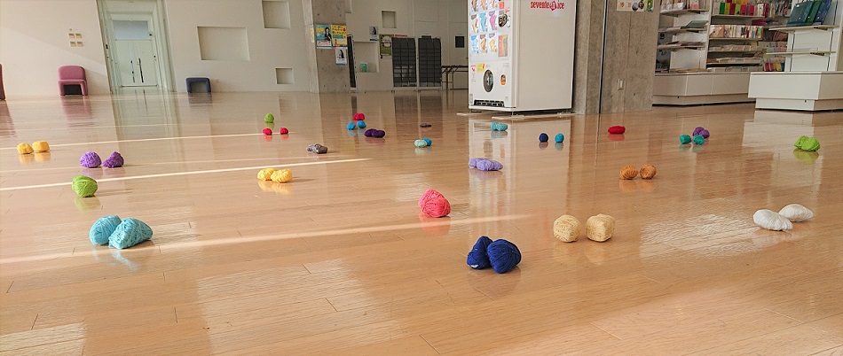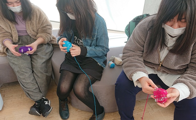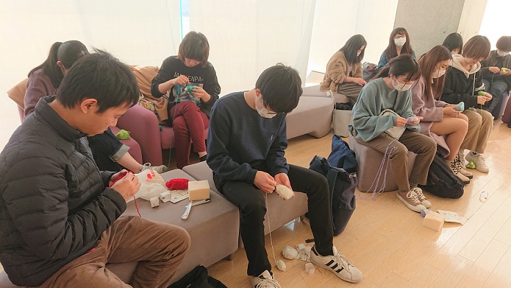それぞれ配られた石の形にスチロールをカットしたら、次は毛糸を隙間なく巻き付けます。