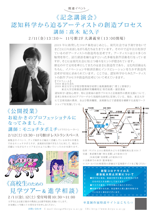今日と明日には公開講評会、明日の午後からは髙木紀久子先生による記念講演会、明後日は卒業生であるイラストレーターのモニョチタポミチさんの公開授業と、盛りだくさんでお送りします。