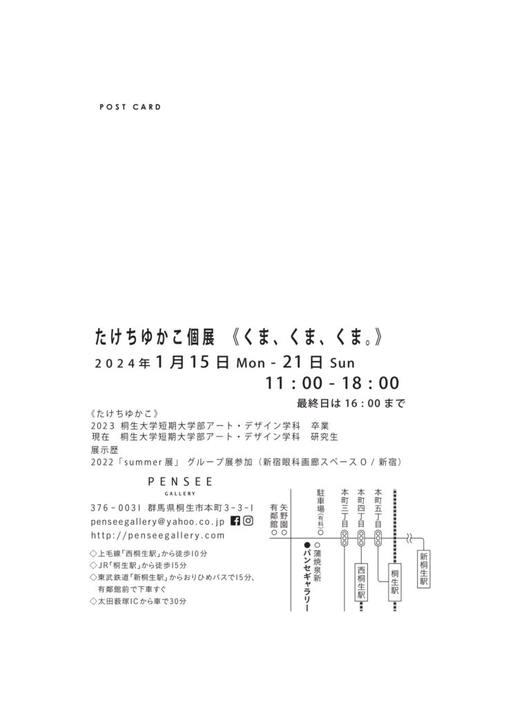 短期大学部 アート・デザイン学科研究生のたけちゆいかこさんの個展「くま、くま、くま。」が桐生市のPENSEEギャラリーにて開催中です。