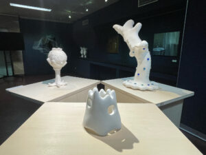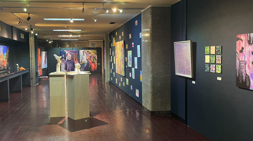 展示作品は、油彩、インスタレーション、彫刻、アニメーションなど多様な表現手法で構成されています。
