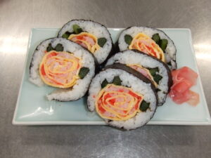 そして調理実習Ⅰを教えて頂いてる松岡先生が学生達の為に作って下さった、切ると断面が薔薇の形になるバラの花ずしも完成!