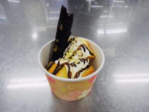 生クリームとチョコソース、アーモンドダイスがかかっています♡