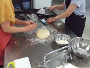 始めにパン生地の成形とクッキー生地をのせる仕上げまで、そして二次発酵の合間に生地の作り方までと、2回に分けてデモンストレーションをしました。