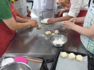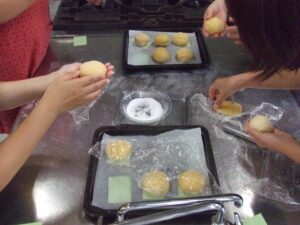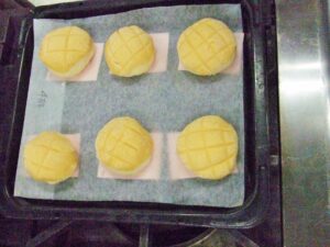 調理実習室にて、メロンパン作りが行われました。たくさんのご参加があり、嬉しい限りです。