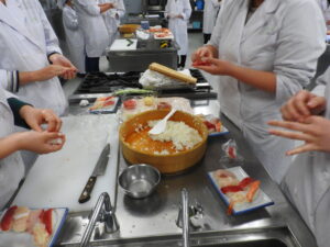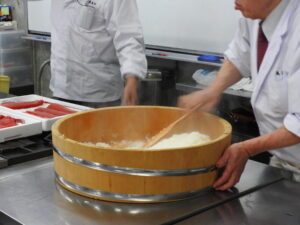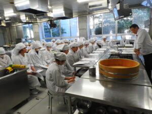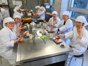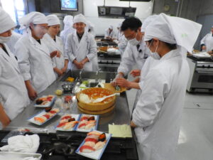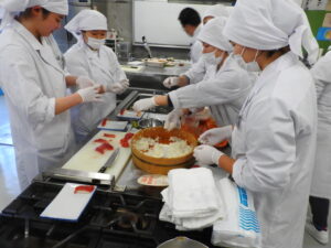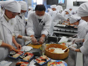 講義の後は各作業台に分かれ、班ごとに自分の握り寿司と巻物寿司を作ります!