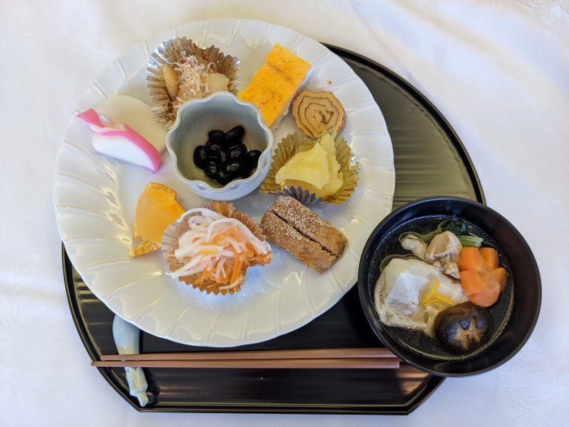 (写真では、雑煮にねじり梅と亀甲しいたけが入っています。)