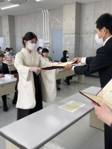 2年間担任であった橋爪先生から1人1人手渡しにて学位記を受け取り、