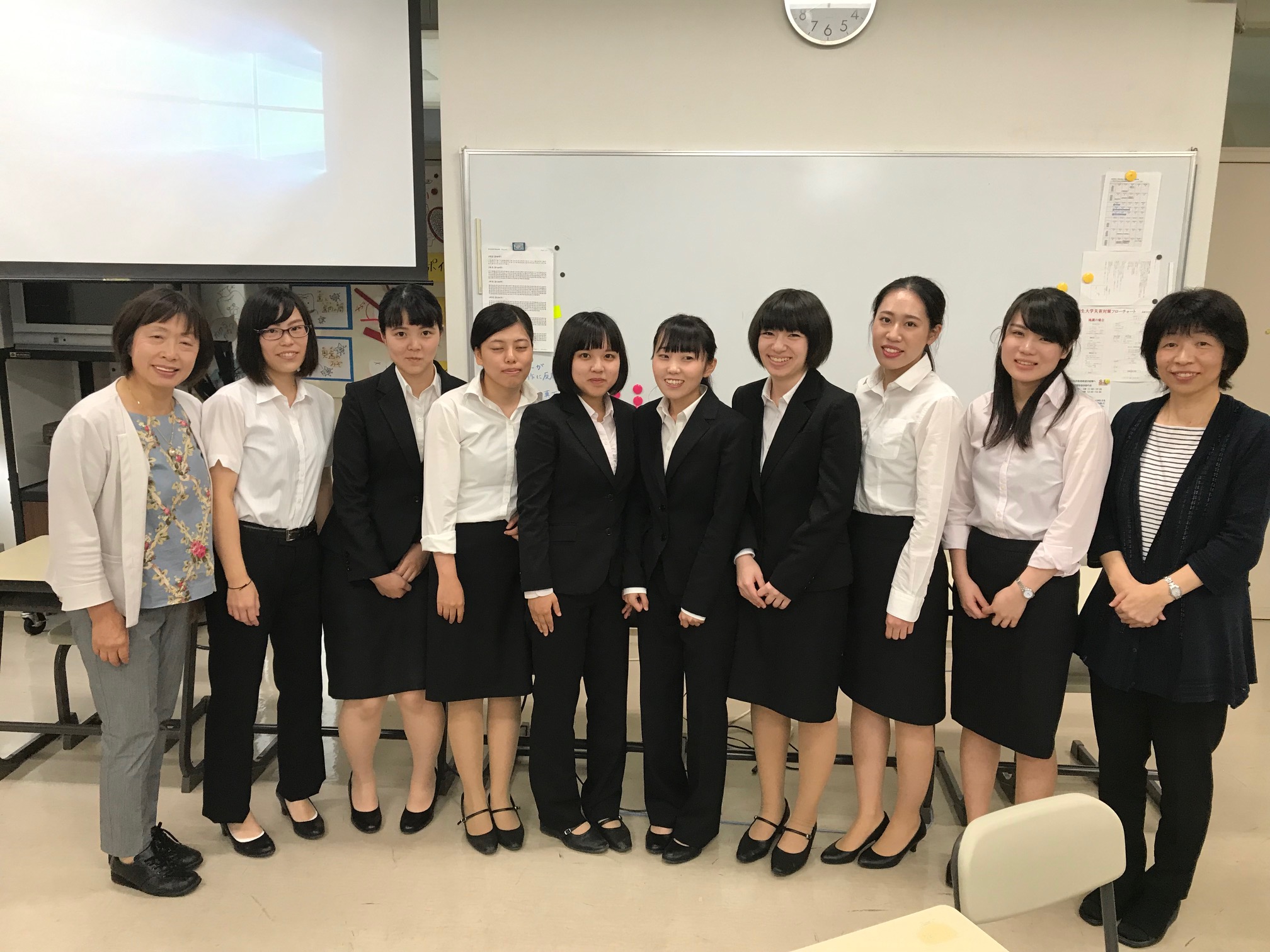 教育実習(養護実習)発表会の最後に学校保健担当の黒岩先生、間戸先生と学生たちと記念撮影です。