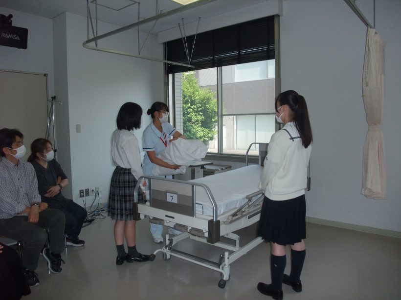 ミニ体験では桐大・学生と一緒にベッドメーキングに挑戦しました。
