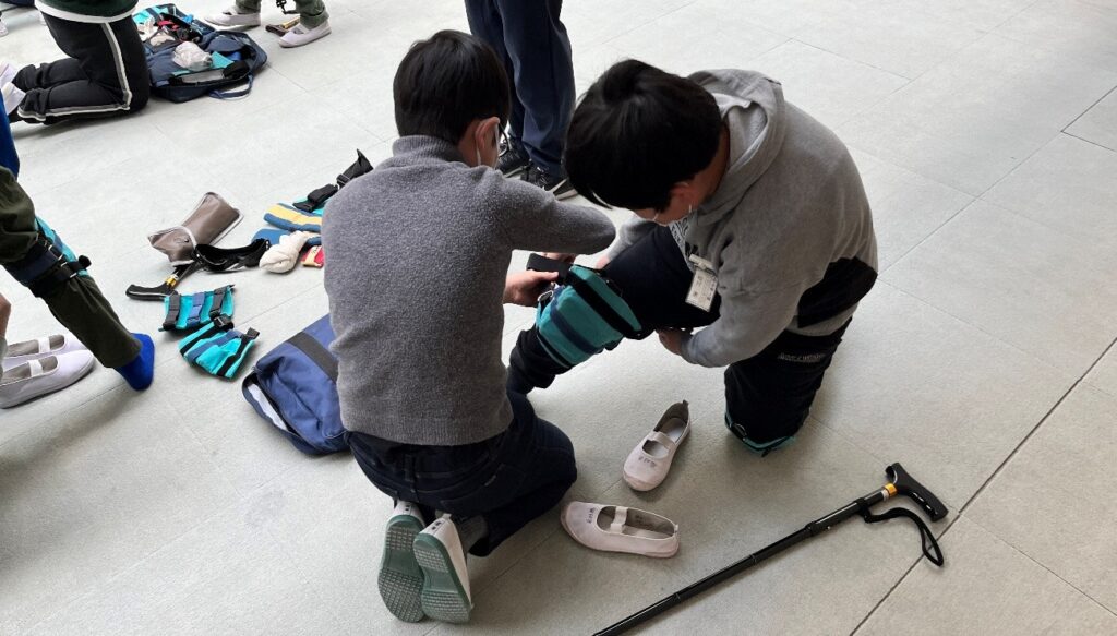 小学生の皆さんにも実際に重たい装具をつけてもらい、高齢者の疑似体験をしていただきました。