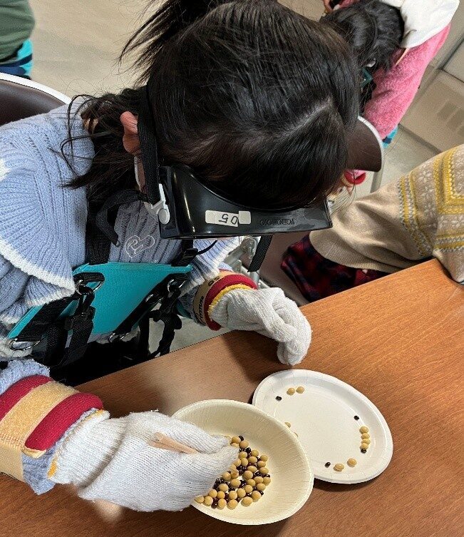 特殊なゴーグルや軍手を付けてのお箸で豆がうまくつかめるかな?