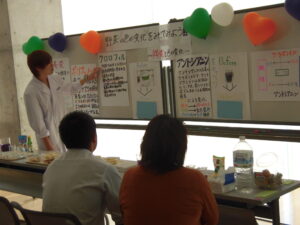 レストランでランチした後は、ミニ体験コーナーで、野菜の色素の実験にトライ。紫キャベツのアントシアニンに対してpHを変化させ色調の変化やゴボウの褐変を観察したりしました。もちろんその講師は、医療保健学部 栄養学科1年イケメン?男子学生です。