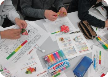 ↑ 食事バランスガイドについてのお話し ↑ クロスワードパズルと紙媒体の食育教材を組み立てているところです