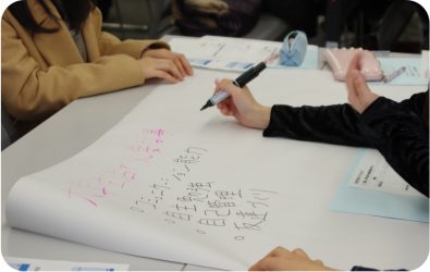 午前の2時間目はY先生の高校生活と大学生活の違いについてお話を聞いた後、「大学生活で必要なこと」をグループでディスカッションしました。「必要なこと」と「やってみたいこと」を書き出して、班ごとに発表をしました。