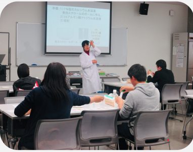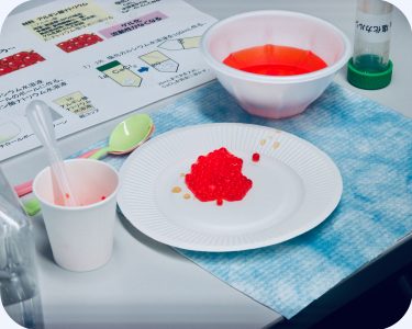 模擬授業では、「化学であそぼう!」のテーマのもと、生化学担当の教授とともに人工イクラ作りに挑戦です。海藻多糖類とカルシウム塩で、プチプチイクラの完成です。