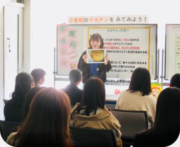 ミニ体験コーナーでは、医療保健学部 栄養学科2年生の学生が生徒さんと共に、小麦粉からグルテンというタンパク質を抽出する実験を行いました。強力粉・中力粉・薄力粉などの小麦粉の種類によってグルテン量の違いが確かめられました。
