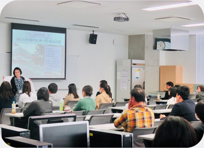 11時からは、学科長と助教の先生から学科説明がありました。生徒の皆さんだけでなく保護者の方を含め、皆さん真剣に聞いておられました。