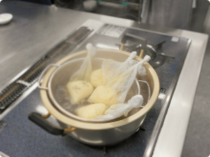 ↑模擬講義の様子 ↑ミニ体験のパッククッキング中… 実際の災害時はカセットコンロで加熱をします。(∗メニューは「ツナじゃが」と「蒸しパン」でした∗)