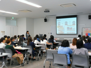 ←学科説明の様子 学科長の宮原先生から管理栄養士やぐんま未来大学医療保健学部 栄養学科の学びについての話しがありました。