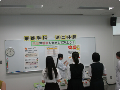 お昼のランチ体験のあとは恒例の医療保健学部 栄養学科ツアーです。ツアーでは毎回新しいミニ体験を準備しています。