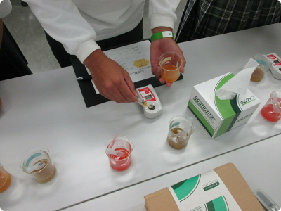 「果物の糖度を測定してみよう!」では、ぶどう・もも・すいかの糖度測定を体験していただきました。