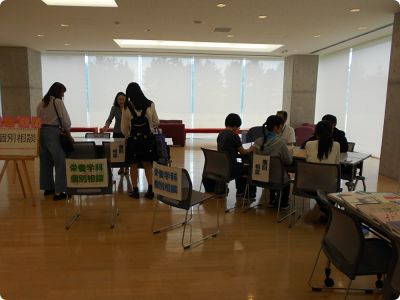 個別相談のコーナーには、今回も多くの高校生、保護者の方に参加していただきました。大学の詳しい入試情報など、直接先生とお話しできる場です。