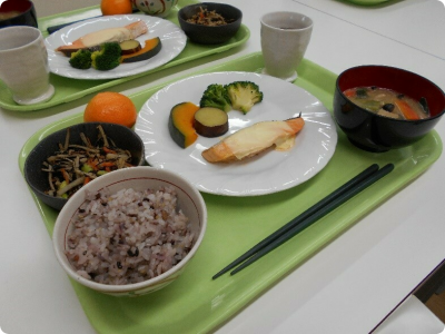 ロコモ予防の料理の食体験では、雑穀入りご飯、鮭のチーズ焼き ~ブロッコリー、かぼちゃ、さつまいも添え~、ひじきと根菜のサラダ、具だくさん味噌汁というメニューを試食していただき、ロコモ予防に望ましい料理や食材について実感していただきました。