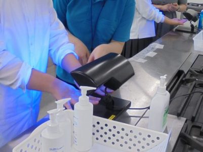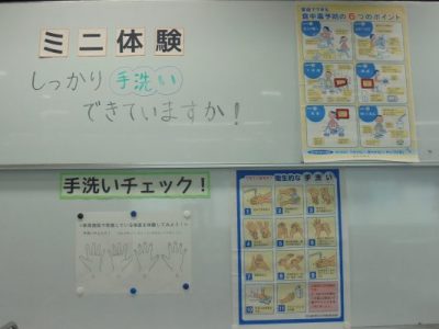 実際に手を洗ってみてから、ブラックライトで洗い残しをチェックしました。いろいろな感染症の予防にも役立ちますので、ぜひ手洗いをする時に「衛生的手洗いの手順」を思い出してくださいね。