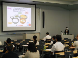 医療保健学部 栄養学科では、はじめに山﨑純一学長よりビデオメッセージ、続いて影山晴秋学科長より学科説明、齋藤陽子助教より
