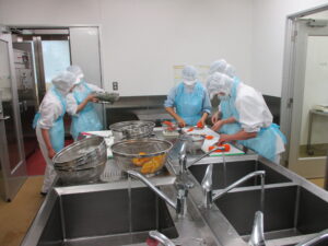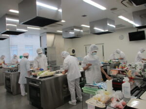 給食経営管理論実習の臨地実習では、実践の場において適正な価格で安全かつ栄養バランスの優れた食事を提供するために、作成した献立を協力して調理し、