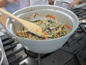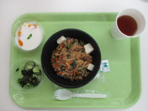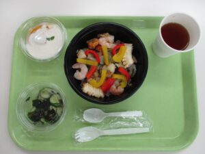 この日は、丼メニューで中華丼とマーボー豆腐丼を50食作りました。野菜を洗い、切裁、スチームコンベクションオーブンで具材を加熱、