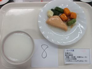 そのほかにも給食施設から課題として出していただいた弁当給食や、高齢者施設用の朝食・昼食として、常食、きざみ食、ペースト食などを実習しました。