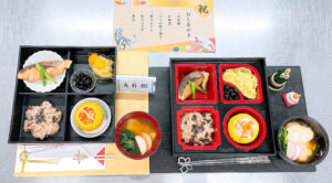 左から(下段)お赤飯、紅白なます、お雑煮