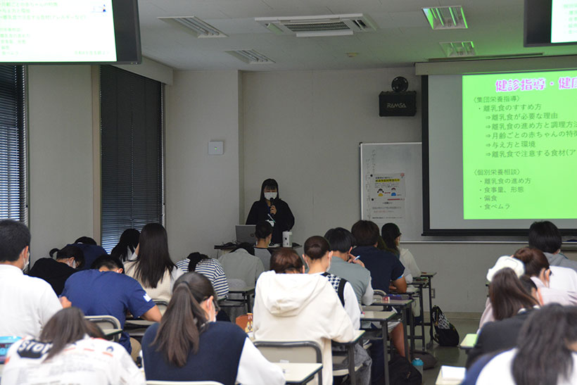 これまでも医療やこども園、学校給食で働く管理栄養士の先生の話を聞きましたが、今回は渋川市保健センターで管理栄養士として活躍している本学科の卒業生に講義をしてもらいました。