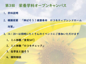 当日は医療保健学部 栄養学科の説明や模擬授業「延ばそう!健康寿命 ロコモティブシンドローム対策」があります。
