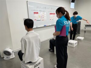 下肢筋力テストでは40cm、30cm、20cm、10cmの箱の上に座り、