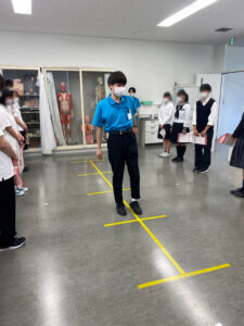歩幅テストでは歩く時の歩幅からロコモ度を測定します。大股で2歩歩き歩幅を測定。