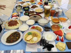 実物そっくりなフードモデルを使って主食、主菜、副菜、汁物、デザート、飲み物から1食分の献立を選ぶと、