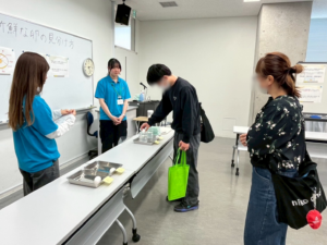 1つ目は「卵の品質判定:新鮮な卵の見分け方」です。この体験では、新鮮な卵と古い卵をさまざまな方法で比較していただきました。